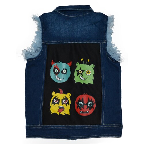 - Otra InformaciónTalla 1 año: Largo 42, ancho 29, hombro 21.5 cm. Original chaleco de mezclilla rockero para niños y niñas con estoperoles sin punta, back patch estampado en la espalda con tintas no tóxicas libres de ftalatos.