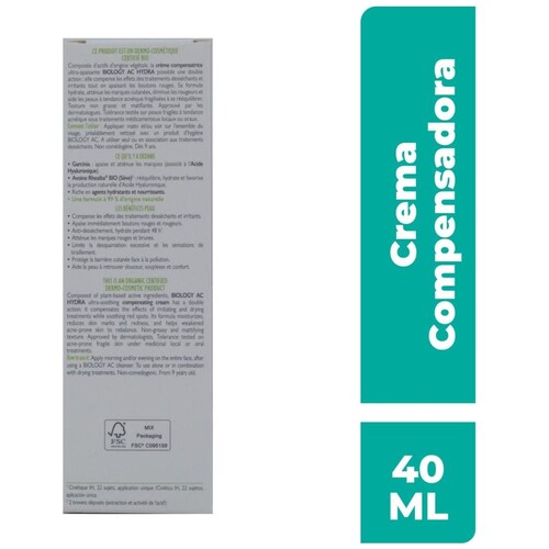 BIOLOGY AC HYDRA 40 ML. Crema compensadora ultracalmante. Se puede utilizar sola o como complemento de tratamientos desecantes. Para pieles mixtas-grasas con tendencia al acné. Ayuda a calmar la piel al instante desde su aplicación y la hidrata durante 48 horas. Limita la descamación excesiva y la sensación de tirantez. Con el uso regular de la crema hidratante, la piel queda calmada, hidratada, reconfortada y suave. Formulada con ácido glicirretínico y extracto de plántulas de Avena Rhealba, un ingrediente calmante enriquecido con ingredientes hidrocompensadores, está delicadamente perfumada y no deja sensación grasa ni pegajosa. Una excelente base para la aplicación del maquillaje. No comedogénico.