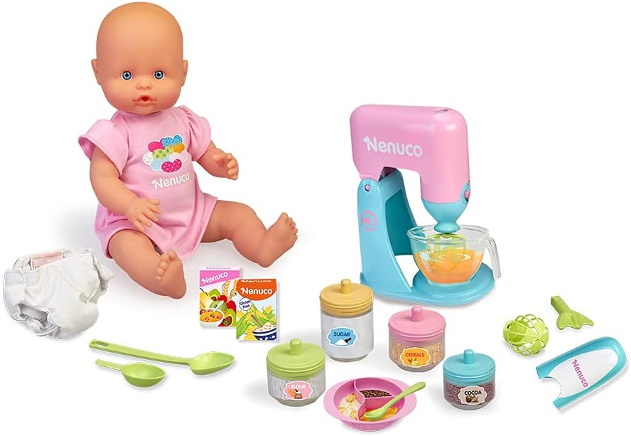 Nenuco ¿Qué comemos hoy? Incluye dos accesorios electrónicos: una batidora y una batidora de repostería con 4 accesorios diferentes que se pueden compartir para hacer diferentes papillas. Accesorios: 4 tuppers, 3 cucharas diferentes, dos cajas de cartón, un plato, un medidor y un pañal reutilizable confeccionado en tela. Nenuco es una muñeca de 42cm de cuerpo duro que luce un bonito cuerpo rosa. Nenuco puede comer y beber.