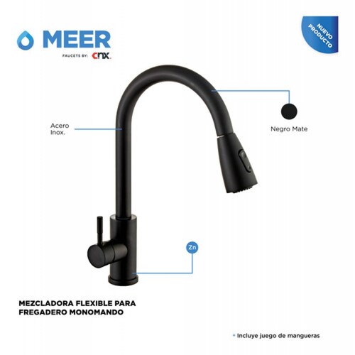 - Mezcladora Monomando Retráctil para Fregadero fabricada en Acero Zinc con acabado negro mate. Las medidas son de 41 centímetros de altura y 23 centímetros de profundidad. El cuello retráctil permite extender y dirigir el flujo de agua con mayor libertad, facilitando la limpieza de utensilios grandes o recipientes voluminosos. Cuando no esté en uso, el cuello retráctil se pliega de manera ordenada, proporcionando un aspecto más limpio y organizado en el fregadero.