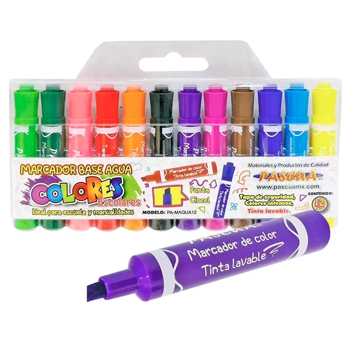 Paquete de 12 Marcadores base agua PASCUA plumon grueso tinta lavable buen regalo para niños escolar Detalles del artículo Se presentan en una selección de 12 llamativos colores intensos Estos plumones han sido especialmente diseñados para que niños a partir de 4 años hagan sus proyectos diarios No tóxico. Su diseño cuenta con una punta cincel y fija de tamaño medio resistente a la presión. Ideal para escuela y manualidades. Tapa seguridad.