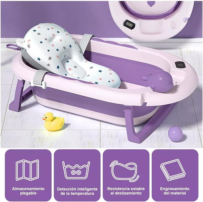 A Tina de Baño para Bebé Plegable con Termómetro y Cojín Antideslizante – Ideal para Viajes, Segura y Ecológica, Incluye Accesorios de Baño, Púrpura.