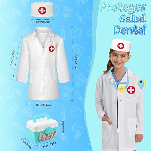 【41Pcs Kit de Doctora Juguetes】: El kit de doctora juguetes incluye bata y gorro de médico, estetoscopio electrónico con luz y sonido, termómetro, equipo de infusión, jeringuilla, frasco de medicamentos, pastillas, cepillo de dientes, pasta de dientes, dentadura postiza, pinzas, cuchara , vendas, bisturí, jabón, y palés más.