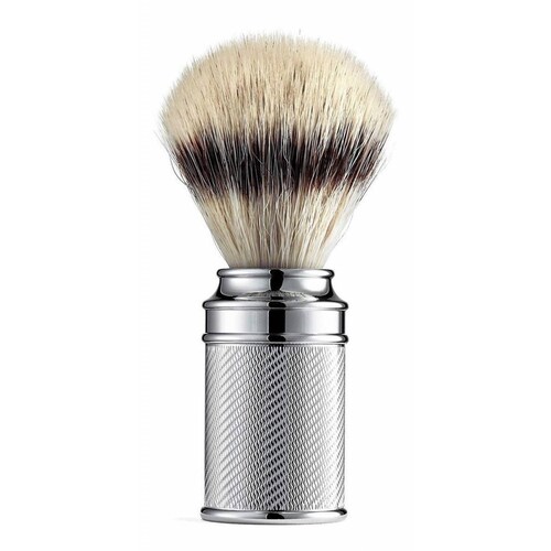 - Tradicional brocha de afeitado con fibra sintética, material de manejo de metal cromado,