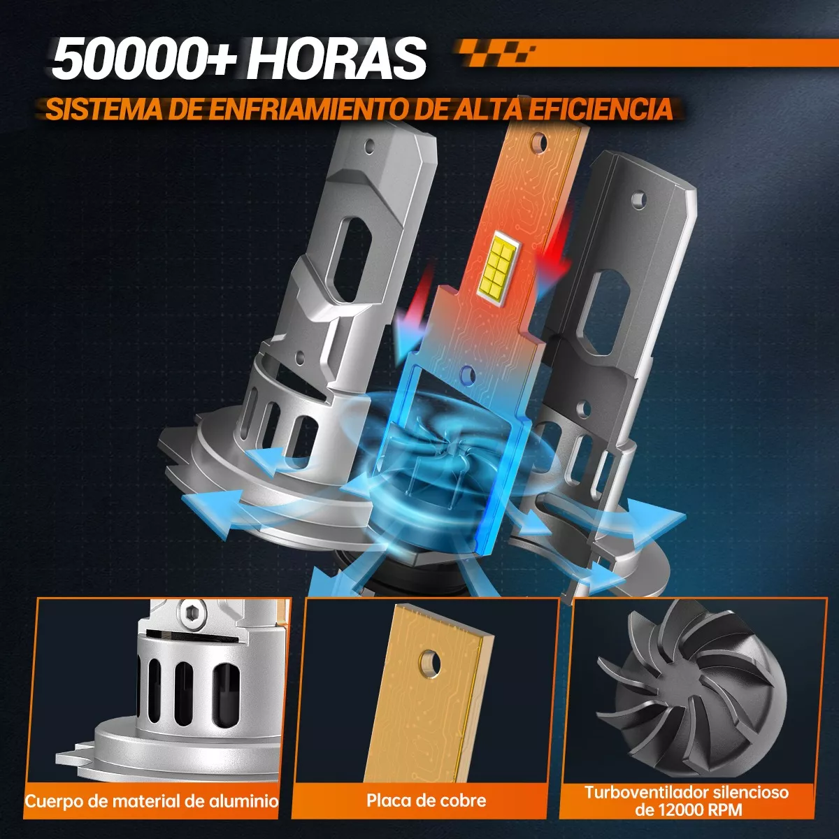 Sistema de enfriamiento eficiente: cuerpo de aluminio de primera calidad, disipador de calor tallado y turboventilador silencioso de 12,000 RPM. El eficiente sistema de refrigeración facilita la disipación del calor, prolongando la vida útil de las bombillas LED H7 a más de 50.000 horas.