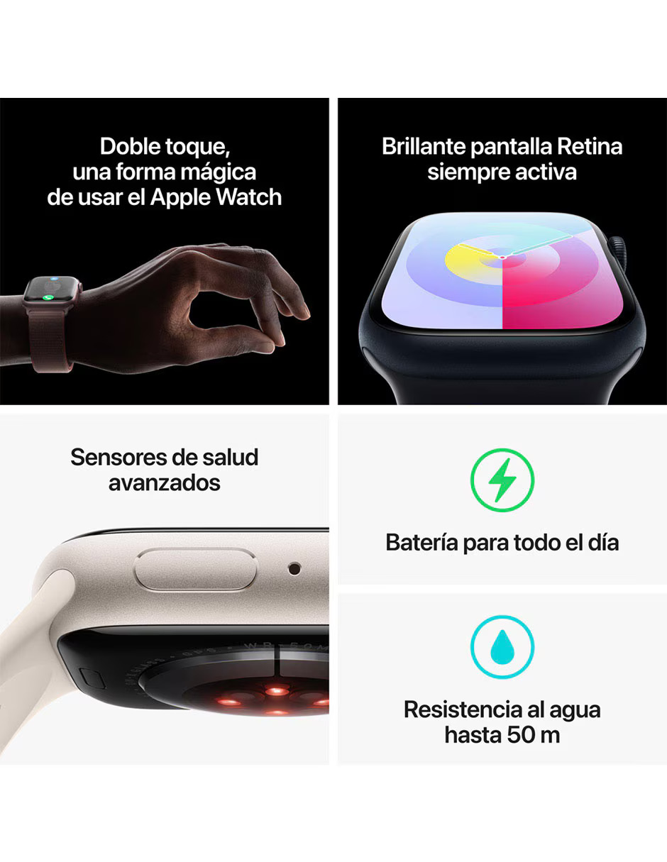 Incluye:Apple Watch series 9, correa y cable de carga magnetica rapida USB-C