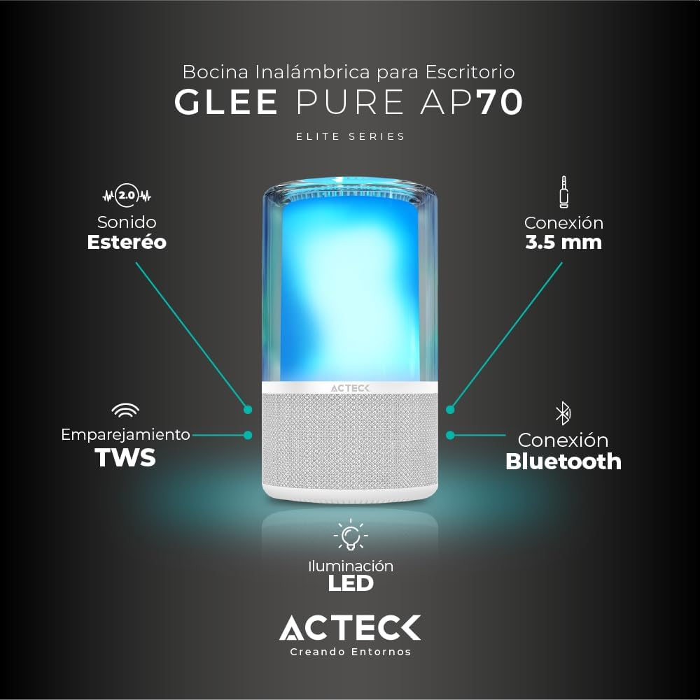 BOCINA ACTECK GLEE PURE AP70 BLANCO BLUETOOTH 5.2 3.5MM USB-C ILUMINACION LED ELITE SERIES AC-936392