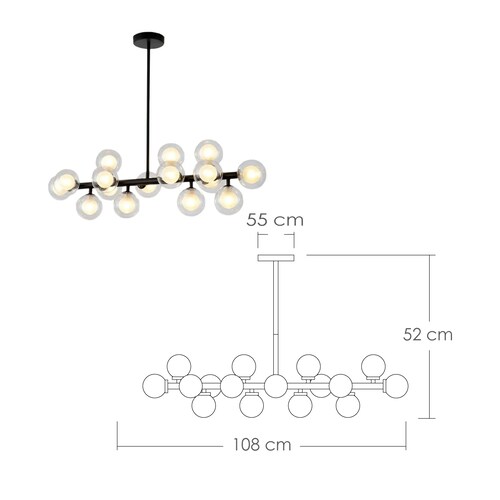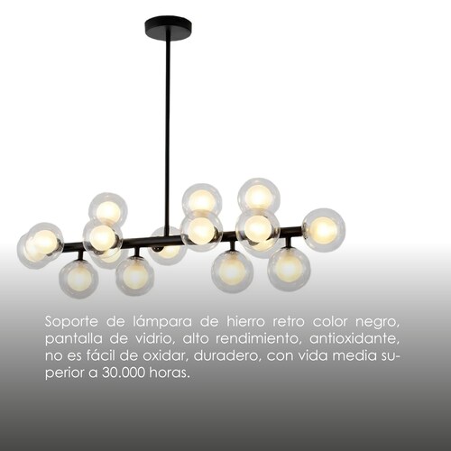 MATERIAL: Metal MEDIDAS: 108 cm de ancho, 52 cm de alto, base 55 cm COLOR: negro CONTENIDO: Lámpara de barra, pantallas de vidrio, materiales para su instalación (taquetes, tornillos, base). No incluye bombillas VOLTAJE: 110 – 260 V. CUALIDADES Material: Soporte de lámpara de hierro retro color negro, pantalla de vidrio, alto rendimiento, antioxidante, no es fácil de oxidar, duradero, con vida media superior a 30.000 horas. Fácil de instalar: Esta lámpara colgante incluye todos los accesorios de montaje para una instalación rápida y fácil. Área de irradiación: 10-25 metros cuadrados. Esta resistente lámpara de techo llama la atención. Bombillas: Adecuado para bombillas de tipo G4, totalmente regulable cuando se utiliza con bombillas regulables y un interruptor de intensidad compatible. CUIDADOS Limpia con un trapo húmedo y crea una atmosfera cálida todos los días. Esta lámpara colgante de 16 luces tiene una estructura simple y líneas elegantes que se pueden combinar armoniosamente con muebles de estilo moderno, retro o urbano, es perfecta para cualquier espacio, como salón, comedor, cocina, dormitorio, restaurante, bar, cafetería, etc. Puedes elegir el tamaño que necesites según el estilo de decoración de tu hogar. Debido al efecto de iluminación, brillo del monitor o embarque de llegada, podrían existir algunas diferencias de color y tamaño, entre la foto y el producto físico. ¡Agradecemos su comprensión!