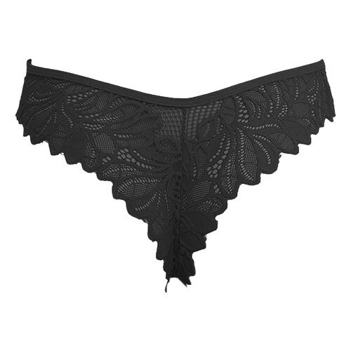 Tanga elaborada en microfibra enfrente y en la parte trasera de delicado encaje con puente de algodón.