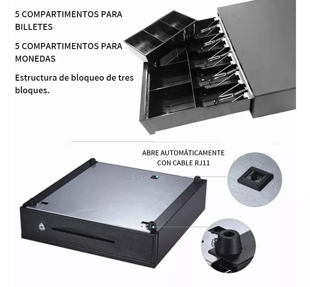 Marca Fnbrli Modelo E405 Voltaje 127/220V Color Negro Registros de producto Número de registro RSPEBT/RSGRA 14568 Otros Es fiscal No Es portátil Sí Con pantalla táctil No Con impresión térmica No Incluye cajón de dinero Sí Cantidad de departamentos 10 Cantidad de cajeros 10 Cantidad de códigos PLU 10 Conectividad USB Accesorios incluidos USB Altura 11 cm Ancho 405 cm Profundidad 41 cm Peso 6 kg Incluye batería No Cantidad de botones 1 Estructura de bloqueo de tres engranajes de doble capa, 5 ranuras para billetes, 5 ranuras para cambios (se pueden levantar tres ranuras). Combinación de frentes de cajones de acero y metal. En el estuche se pueden guardar documentos importantes como billetes, monedas e incluso billetes y billetes. Es compatible con todas las marcas de impresoras de recibos. Construcción de acero resistente. Durabilidad de 4 millones de operaciones. 3 posiciones de bloqueo para máxima seguridad del efectivo. ahorrar espacio en el mostrador Peso neto: 6Kg. Bandeja de dinero: 5 ranuras para billetes/5 ranuras para monedas Estructura: caja metálica con rodillos de alta resistencia. Interfaz: Impresora de recibos 12v, 24v RJ11 Dimensiones: 40,5 x 42 x 10 cm Microinterruptor: por señal electromagnética Techo abierto: estructura de acero Ranura frontal: acceda a los archivos desde el frente Compatibilidad: Compatible con todas las marcas de impresoras de recibos Bandeja: Titular frontal de metal Panel: Panel frontal de acero inoxidable pintado, 3 botones, 1 línea de conexión, 1 cajón de caja registradora Para mostrar: *Utilice únicamente cajones portamonedas con cerradura * Impresora de recibos con conexión RJ11 6. Ampliamente utilizado en varios supermercados, tiendas, hoteles, empresas, cajeros automáticos, instituciones financieras, bancos, etc.