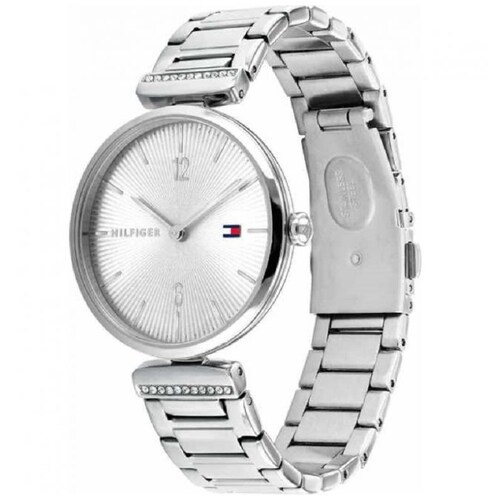 Reloj para dama marca TOMMY HILFIGER, ARIA, brazalete de acero inoxidable en color plata, carátula en color plata, pedrería en parte del brazalete, cristal mineral y hermeticidad de 5 ATM.